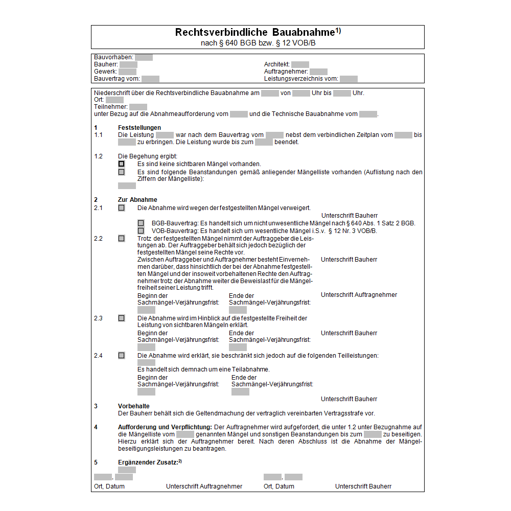 Kostenloses Abnahme VOB Formular als PDF zum Download. Einfaches Ausfüllen für die Abnahme der Gesamtleistung und einzelner Leistungsabschnitte gemäß § 12 VOB/B. Praktisch und rechtssicher.