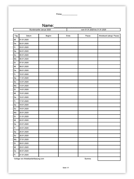 Arbeitszeiterfassung Formular kostenlos herunterladen – praktischer Stundenzettel zum Eintragen von Name, Datum, Beginn, Ende und Arbeitszeit inklusive Pausenabzug für einfache Zeiterfassung im Alltag.