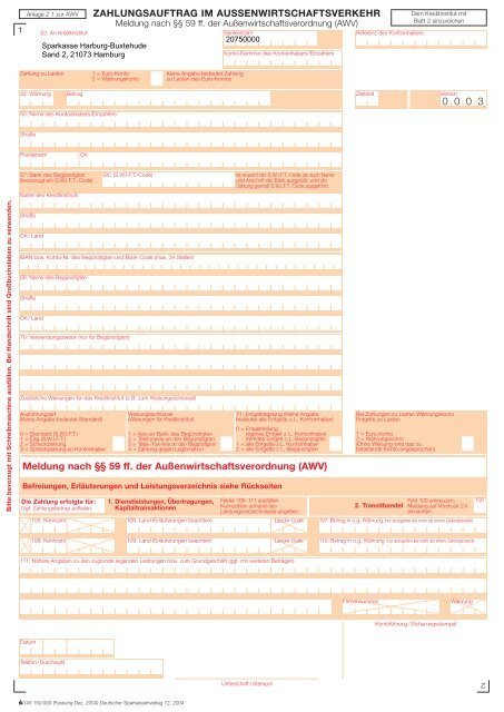 Kostenloses Formular für Auslandsüberweisung bei der Sparkasse herunterladen. Beachten Sie die Meldepflicht gemäß Außenwirtschaftsverordnung. Bei Fragen steht die Hotline 0800 … zur Verfügung.