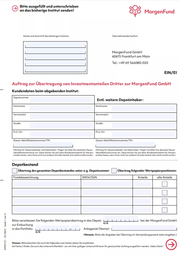 Kostenloses Formular zum vorzeitigen Auflösen Ihres VL-Vertrags herunterladen und problemlos Ihr Morgenfund Depot auflösen. Schnelle und einfache Abwicklung garantiert.