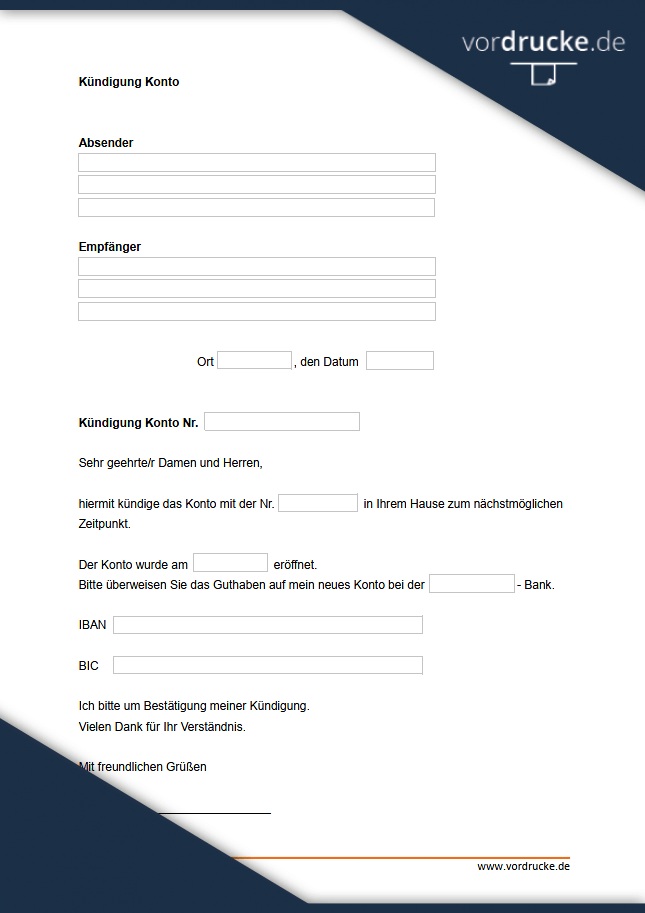 Kostenloses Formular zum Kündigen Ihres Volksbank Kontos herunterladen, einfach ausfüllen mit Ihren Angaben und an das Kreditinstitut senden – schnell, unkompliziert und rechtssicher.