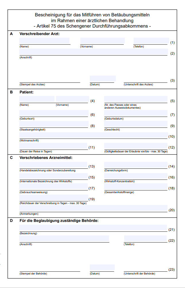 Kostenloses BTM Ausland Formular zum Download verfügbar, beinhaltet wichtige Angaben wie Name, Geburtsort, Geburtsdatum, Nationalität und Passnummer für internationale Patientendokumentation.