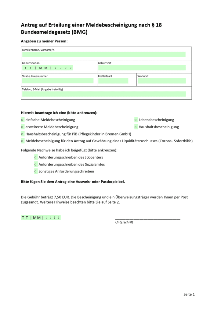 Kostenloses Formular zum Antrag auf Meldebescheinigung herunterladen, mit wichtigen Angaben zur Person und letzter Meldeanschrift für einfache Anmeldung und Behördengänge.