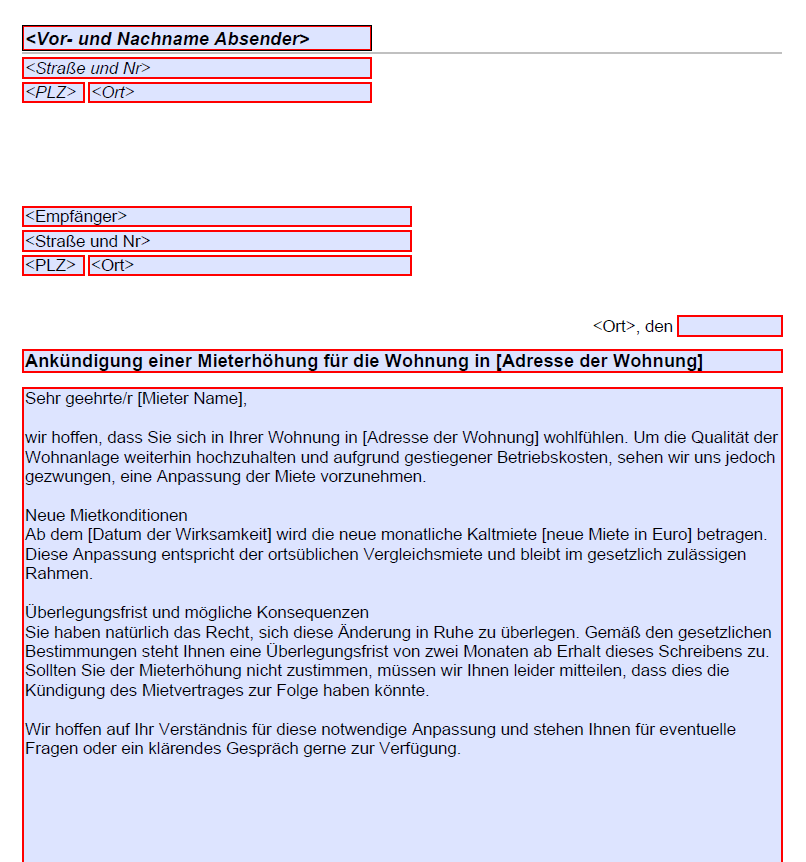 Kostenloses Formular zur Mieterhöhung herunterladen und einfach ausfüllen. Perfekt für Vermieter, die die Miete rechtssicher und transparent anpassen möchten. Jetzt gratis sichern.